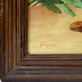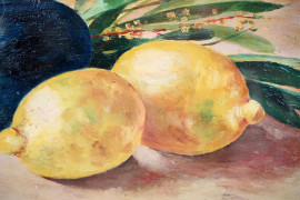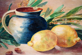 Natura morta, brocca e limoni, olio su tavola, cm 27x39, firmato, entro cornice.