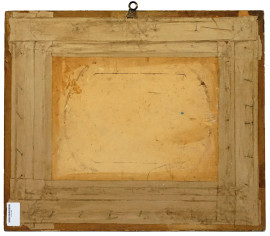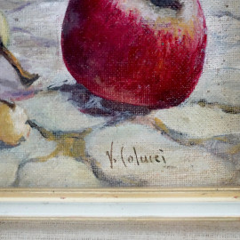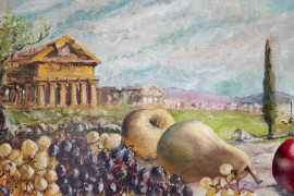 Natura morta, frutta e rovine, olio su cartone telato, cm 33x44, firmato, entro cornice.