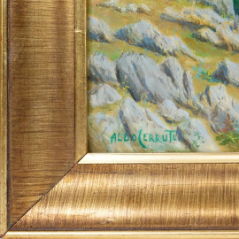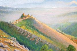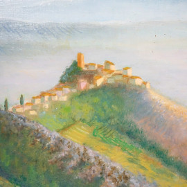 Olevano Romano visto da Bellegra, olio su tavola, cm 40x37, firmato, entro cornice.