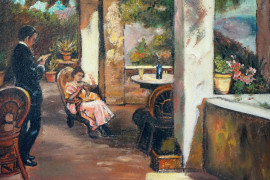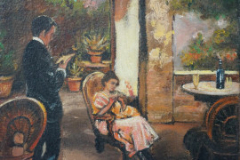 Ozio in terrazza, olio su cartone, cm 26x40, XX secolo, entro cornice.