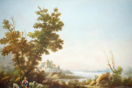 Paesaggio con pastorello e gregge, olio su tavoletta, cm 14x22, firmato, entro cornice