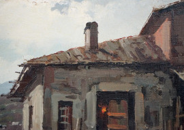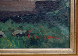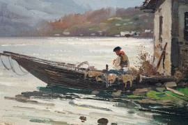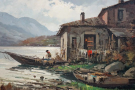 Paesaggio lacustre con figure, olio su tela, cm 50x70, firmato, entro cornice.