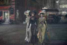 Parigine a teatro, tempera su cartone, cm 36x39,5, firmato, entro cornice.