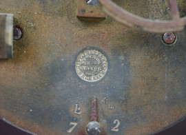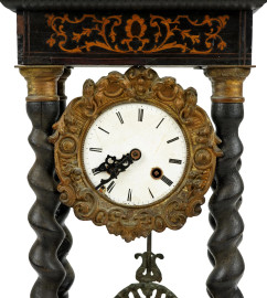 quattro colonnine tortili con capitelli in metallo dorato, quadrante a numeri romani, cimasa intarsiata a motivi vegetali, cm h 42x22x11,5, (difetti, meccanismo da revisionare).