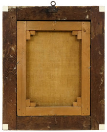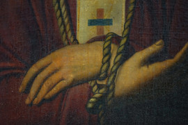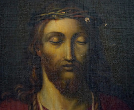 Pittore del XIX secolo, Ecce homo con croce dell'Ordine della Santissima Trinità, olio su tela, cm 48x37, entro cornice, (cadute di colore).
