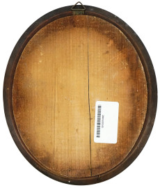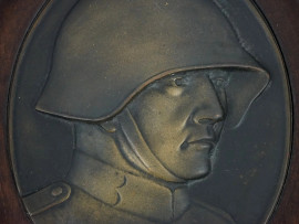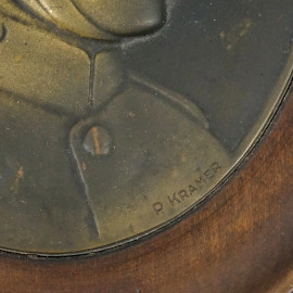 Placca in bronzo ad assetto ovale in metallo raffigurante soldato con elmetto, cm 18x15, firmato P.Kramer, entro cornice in legno.