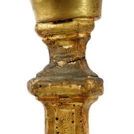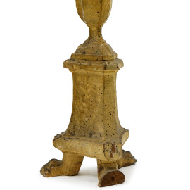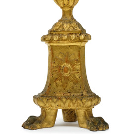 Portacero in legno intagliato e dorato, poggiante su tre piedi leonini, cm h 110, XVIII secolo, (difetti e restauri).