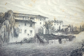 Provenza-Il mulino ad acqua, disegno a matita su carta, cm 13,5x19,5, datato 1860, entro cornice