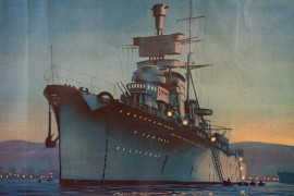 Regia marina - corpo reale equipaggi, oleografia a colori, cm 59x100, XX secolo, entro cornice.