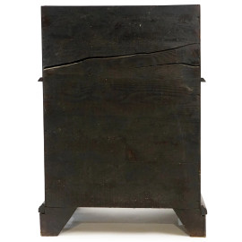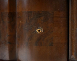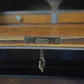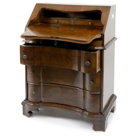 Ribalta in noce e radica, XX secolo, sportello a calatoia celante due cassettini e vuoti all'interno, fronte a tre cassetti, piedi a mensola, cm h 93x68x40, (difetti e mancanze).