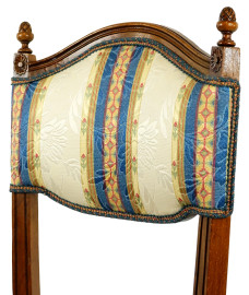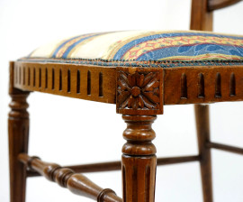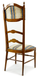 Seggiola in noce, XX secolo, alto schienale intagliato con seduta e cartella rivestite in tappezzeria a righe e motivi floreali, cm h 104,5, (lievi difetti).