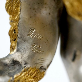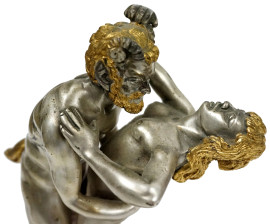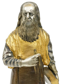 Sei sculture in metallo argentato e dorato raffiguranti due cavalieri, Leda con Cigno, Satiro con Ninfa, Michelangelo e Leonardo da Vinci, alt max cm h 27, basi in materiali diversi, quattro a firma Giuseppe Vasari.