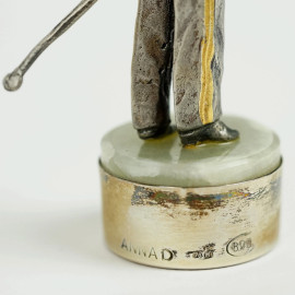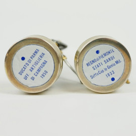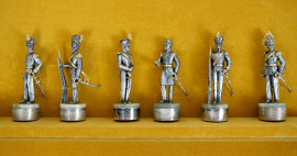 Sei segnaposto raffiguranti ufficiali di regni e ducati italiani in argento 800, particolari dorati, base in onice, cm h 8,5, seconda metà XX secolo, entro cornice