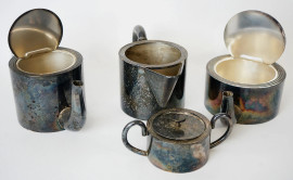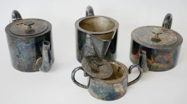 Servizio da thé/caffè in metallo argentato, XX secolo, composto da teiera, caffettiera, lattiera e zuccheriera, misure max cm 11x21, (segni del tempo).