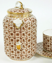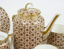 Servizio da thè/caffè in porcellana policroma, Utzschneider & Co., Germania, fine XIX-inizi XX secolo, decori di fiori e finiture dorate su fondo rosa cipria