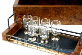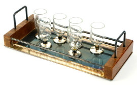 Set da viaggio composto da una scatolina contenente sei bicchierini ed un vassoio all'interno, ingombro tot cm 7x20x10, XX secolo.