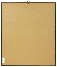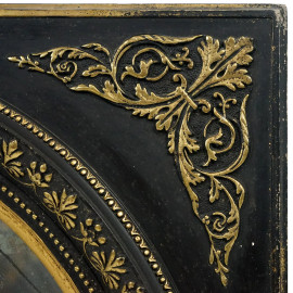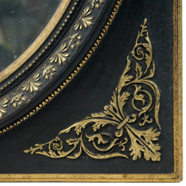 Specchiera in legno ebanizzato, con particolari intagliati e dorati, misure ingombro max cm 78x67, misure luce cm 66,5x55,5, XX secolo, (lievi difetti).