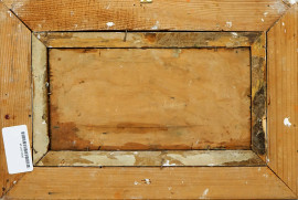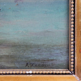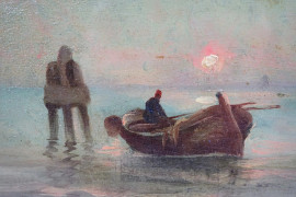 Tramonto con imbarcazione, olio su tavola, cm 12,5x25, firmata, entro cornice.