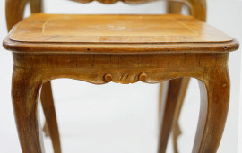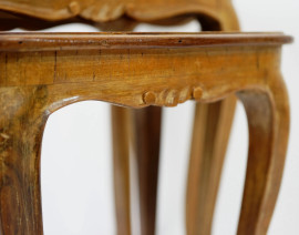 Tre tavolini a nido in legno impiallacciato, inizi XX secolo, piano di linea sagomata, gambe mosse, misure max cm h 58,5x57x35,5, (lievi difetti)