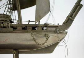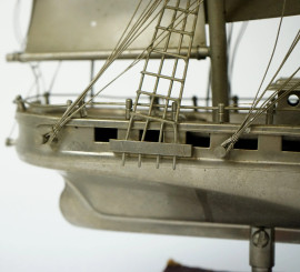 Veliero in metallo argentato, cm h 43x50, base in legno, XX secolo, (difetti).