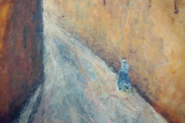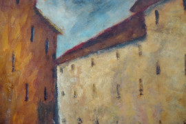 Viale urbano, olio su cartone, cm 60x50, XX secolo, entro cornice.