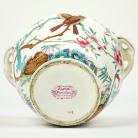 Zuccheriera in porcellana Minton, Inghilterra, fine XIX secolo, prese laterali ad intreccio, decoro policromo raffigurante volatili su rami fioriti, cm h 15, marchio sotto la base, (sbeccature).