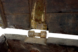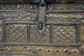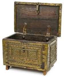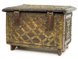 Antico scrigno in legno rivestito in lamina di metallo sbalzata e cesellata a vari decori, cm h 19x28,5x18,5, (difetti, elementi sostituiti).