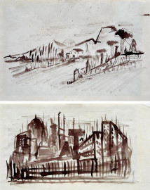 Anton Zoran Music (1909 – 2005), lotto composto da coppia di disegni a tecnica mista su carta raffiguranti Campagna, cm 27x12, firma sul fronte, timbro e archivio sul retro, Città, cm 24x14,6, titolo, timbro e archivio sul retro, anni '50, in cornici.