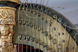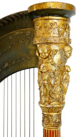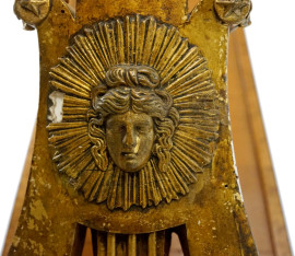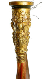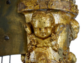 struttura lignea scolpita, con elemento frontale a colonna scanalata e capitello in stucco dorato ornato da cariatidi e cherubini. Nella parte superiore fascia in ottone recante le iscrizioni del fabbricante e numero 1066; cm h 172,5, (difetti)