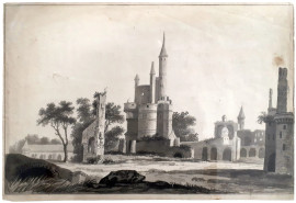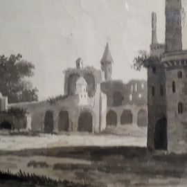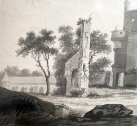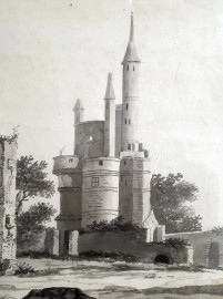 Artista della fine del XVIII secolo, Paesaggio con castello e rovine, grande dipinto ad acquarello monocromo su carta, cm 33x48, con cornice