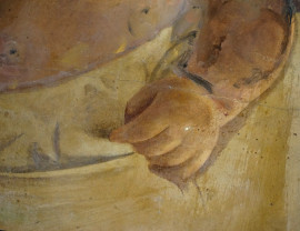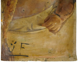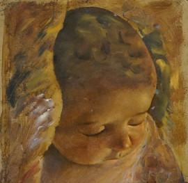 Bambino dorminiente, olio su carta applicata su cartone, cm 19,5x35,5, siglato SF, (difetti)