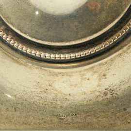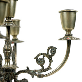 Candelabro a cinque fiamme in argento, bracci a volute, fusto troncoconico, base quadrata poggiante su quattro piedini cesellati, inizi XX secolo, cm h 39, peso gr. 940