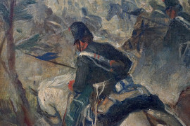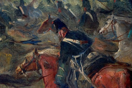 Carica di cavalleria, olio su tavola, cm 29x51,5, firmato