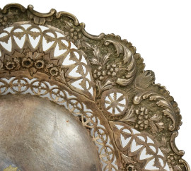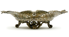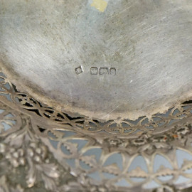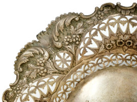 Centrino in argento traforato, Richard Martin & Ebenezer Hall, Inghilterra, XIX secolo, bordo smerlato, decori sbalzati e cesellati a motivi vegetali e floreali, punzoni sul cavetto, cm h 6x22, gr. 280