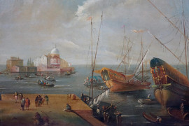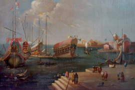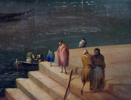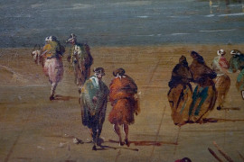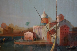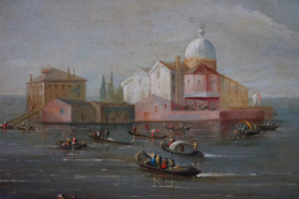 Cerchia di Michele Marieschi (1710-1744), Coppia di vedute di Venezia, olio su tela, cm 110x82, entro cornici