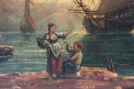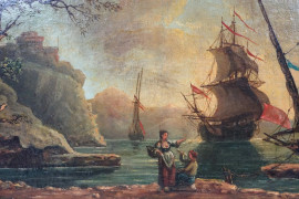 Charles Francoise Grenier de Lacroix (Marsiglia 1700-Berlino, 1779/1782) cerchia di, Paesaggio costiero mediterraneo con il Castello di Castellammare di Stabia e galeone spagnolo, olio su tela, cm 42,2x53,7