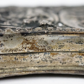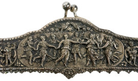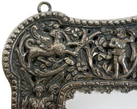 Chiusura per borsetta in argento, metà XX secolo, decori cesellati raffiguranti figure femminili danzanti tra tralci vegetali, popolati da putti musicanti, grifoni e vittorie alate, cm 12x20x1,2, peso gr.270