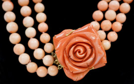 Collana in corallo pelle d'angelo a tre fili, con chiusura in oro 18 kt e corallo a forma di rosa, gr.221