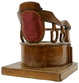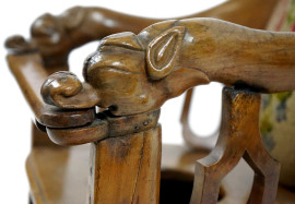 Comoda per bambini in noce, XIX secolo, schienale ricurvo con imbottitura ricamata, braccioli scolpiti, cm h 53,5x47x44, (difetti).