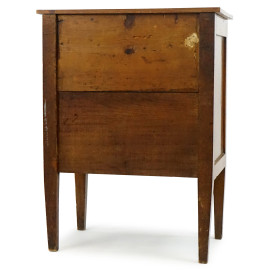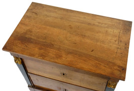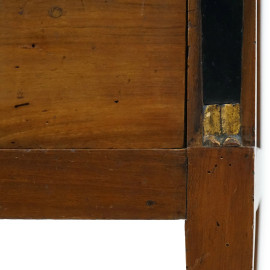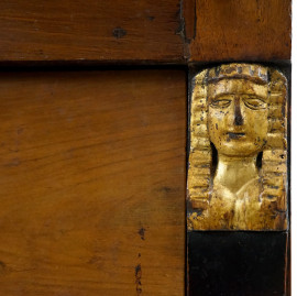 Comodino in noce stile Impero, XIX secolo, fronte a due cassetti incorniciati da lesene ebanizzate sormonatate da teste di sfingi dorate, gambe a obelisco rovesciato, cm h 80x60x36, (restauri)