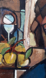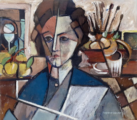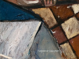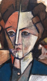Composizione cubo futurista, tecnica mista su tela applicata su tavola, cm 34x39, firmato in caratteri cirillici in basso a destra, con cornice