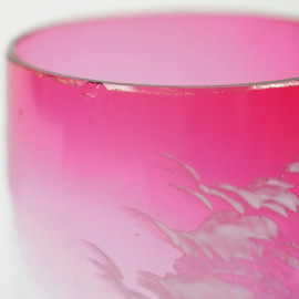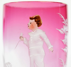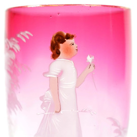 Coppia di calici in vetro rosso rubino con decori dipinti a mano raffiguranti fanciulli con fiori, cm h 14,5, (lievi difetti)