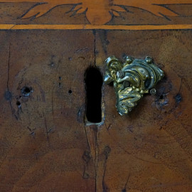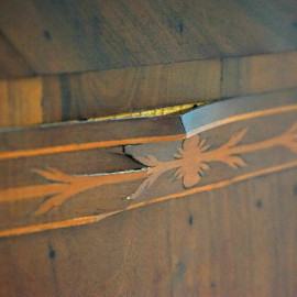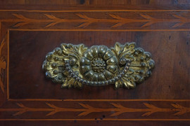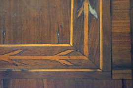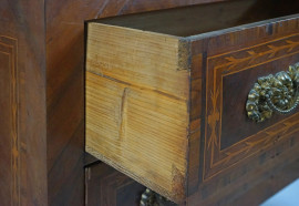 Coppia di cassettoni Luigi XVI, XVIII secolo, in legno impiallacciato ed intarsiato, fronte a due cassetti, gambe troncopiramidali, cm h 88x111x52,5, (restauri, difetti)