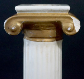 Coppia di colonne in porcellana, fusti scanalati, capitelli e basi dorate, cm h 34, marcate sotto la base, (difetti).