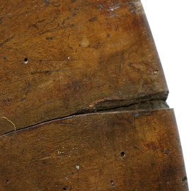 Coppia di consolles a mezzaluna in noce, fine XVIII- inizi XIX secolo, montanti laterali a lira riuniti da traversa sagomata, cm h 75x108x51, (difetti, elementi sostituiti).