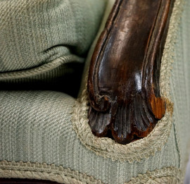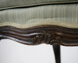 Coppia di poltrone a pozzetto in noce, inizi XX secolo, imbottite e rivestite in tappezzeria verde a righe, cm h 80, (difetti)