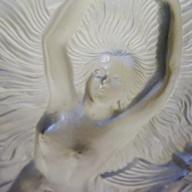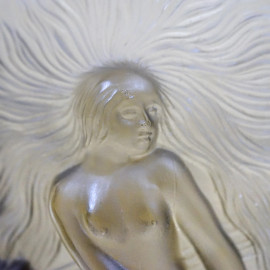 Coppia di vasi in vetro fumè, Verlys France, anni '30, corpo con fascia decorata a rilievo con sirene e delfini, cm h 25.