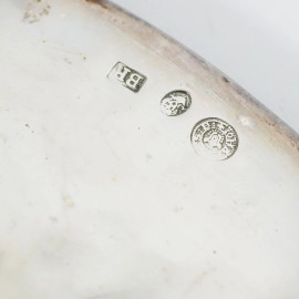 Dieci piatti in metallo argentato Brandimarte, XX secolo, tesa con decori di frutta sbalzati, diam.cm 30, (difetti).