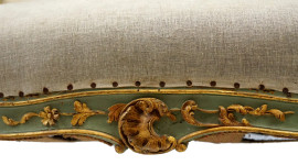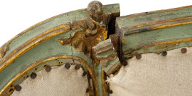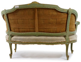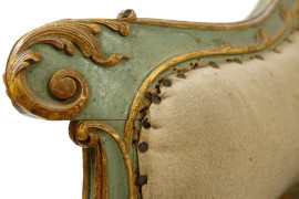 Divanetto in legno laccato, XIX secolo, schienale e seduta rivestiti in tappezzeria color burro, particolari scolpiti e dorati, gambe mosse, cm h 83,5x126x50, (difetti).