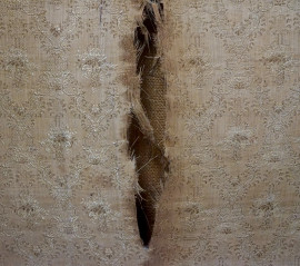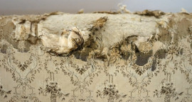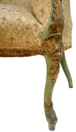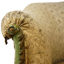 Divanetto in legno laccato, XIX secolo, seduta e schienale rivestiti in tappezzeria color burro, particolari scolpiti e dorati, cm h 83x136x59, (difetti).